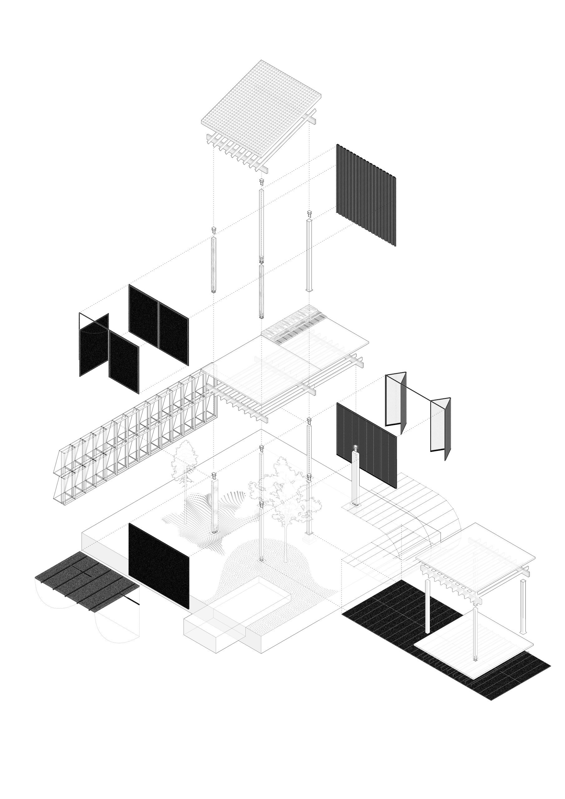 The prototype is a solid articulation of abstract concepts related to water resilience, composed of three main aspects: Solid, Flexible, and Contextual. Embodying the principles of transformation and adaptability, it will be tested in Brugge and Zeebrugge for further refining. The design explores modularity, waste reuse, and dismountability to ensure sustainability and resilience. Made with solid elements, platforms, and flexible volumes, the prototype serves as a framework for creating dynamic, future-proof spaces. It emphasizes the integration of water relationships, the redefinition of boundaries, and the embrace of temporal shifts.