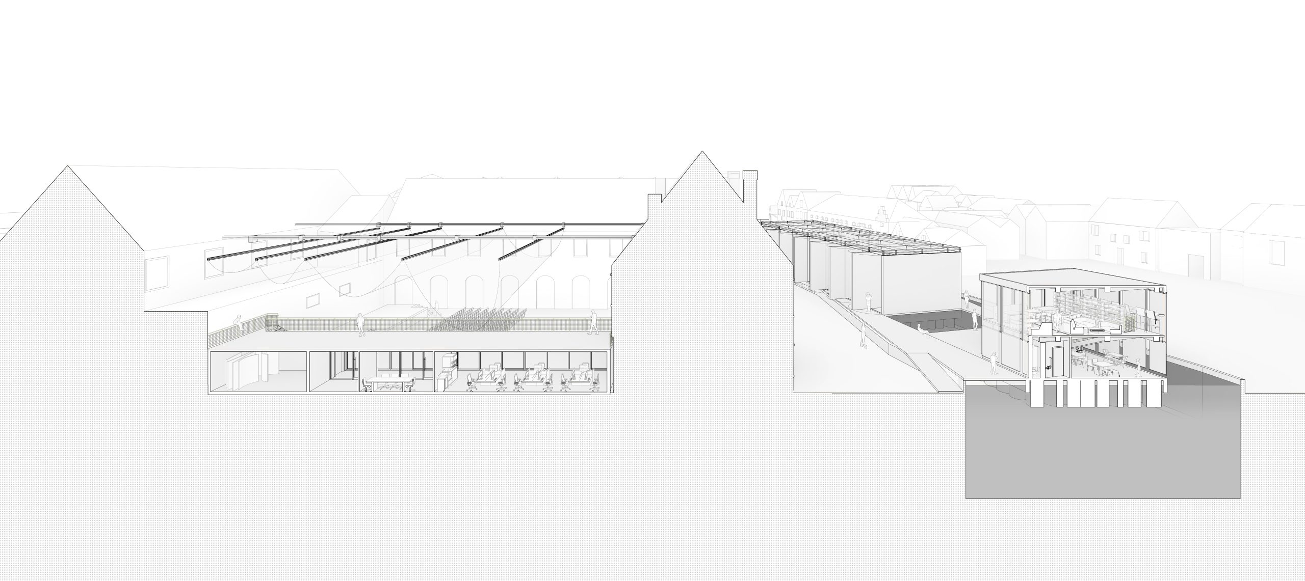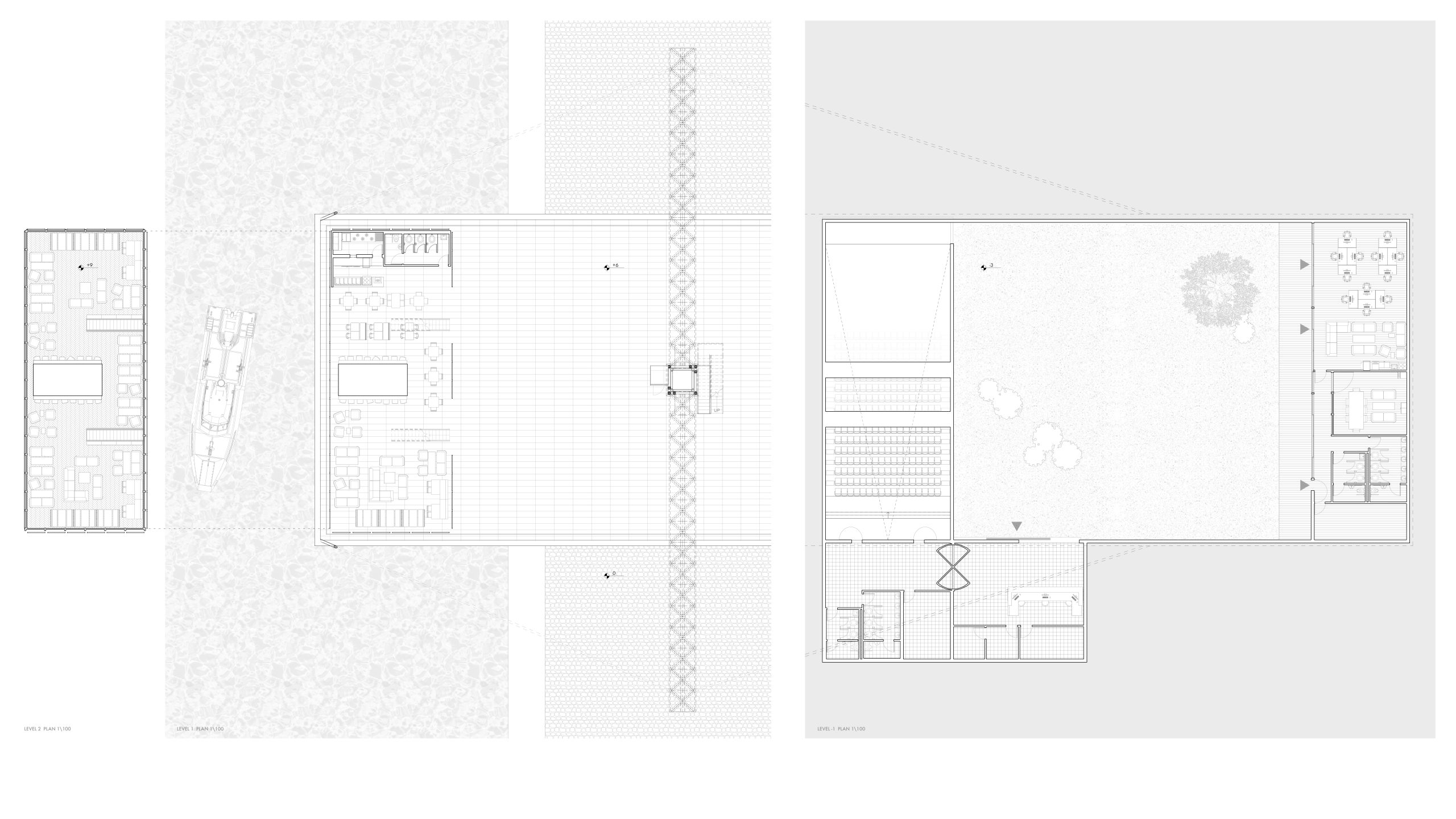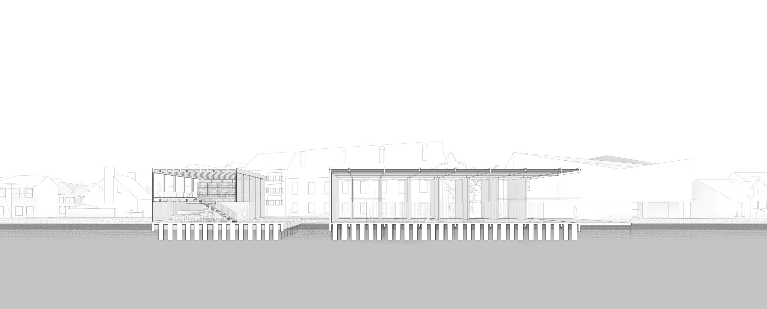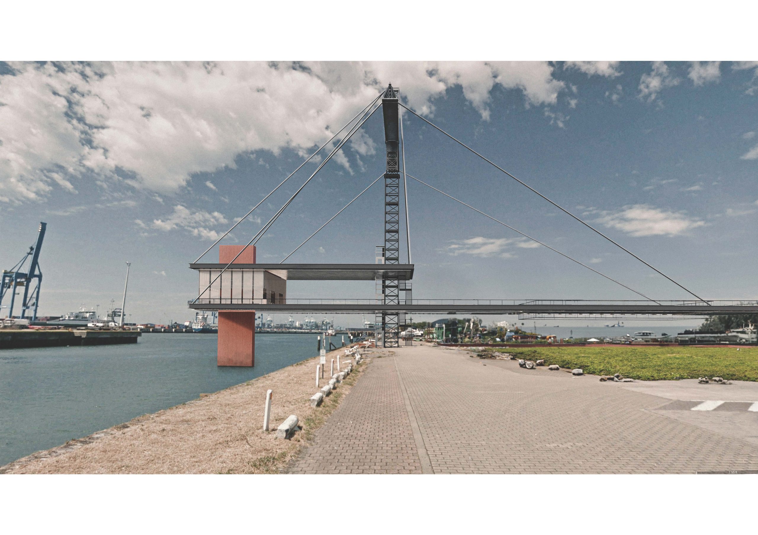 In Zeebrugge, the prototype embraces subtraction, where removed volumes create new spaces for offices and public areas. Elevated, translucent platforms enhance flow and connectivity, while flexible curtains reshape experiences. Solid elements, resembling crane-like structures, reinforce the design’s identity. The project integrates modularity, waste reuse, and water inclusivity, redefining boundaries and transforming the urban landscape with resilience and sustainability.