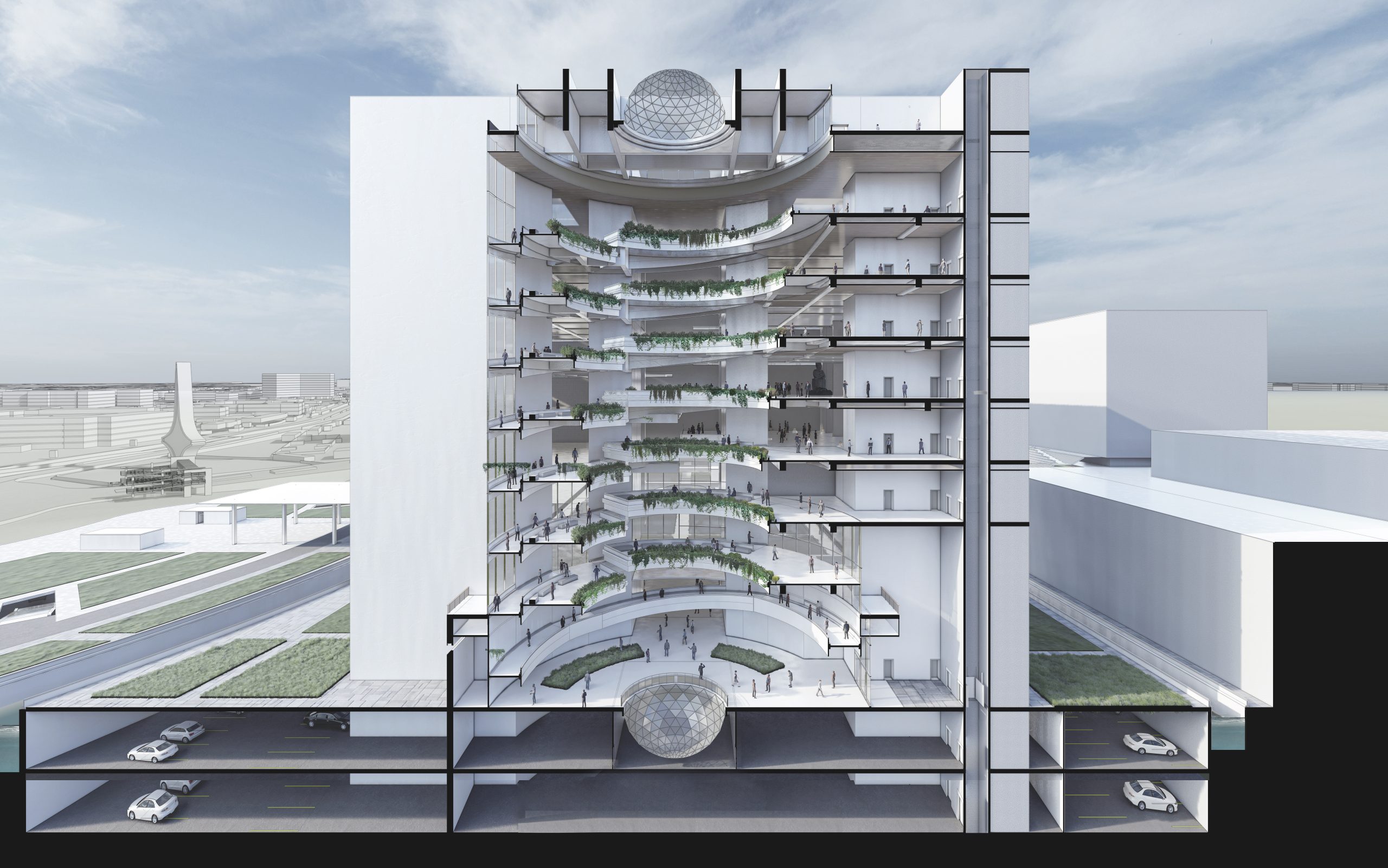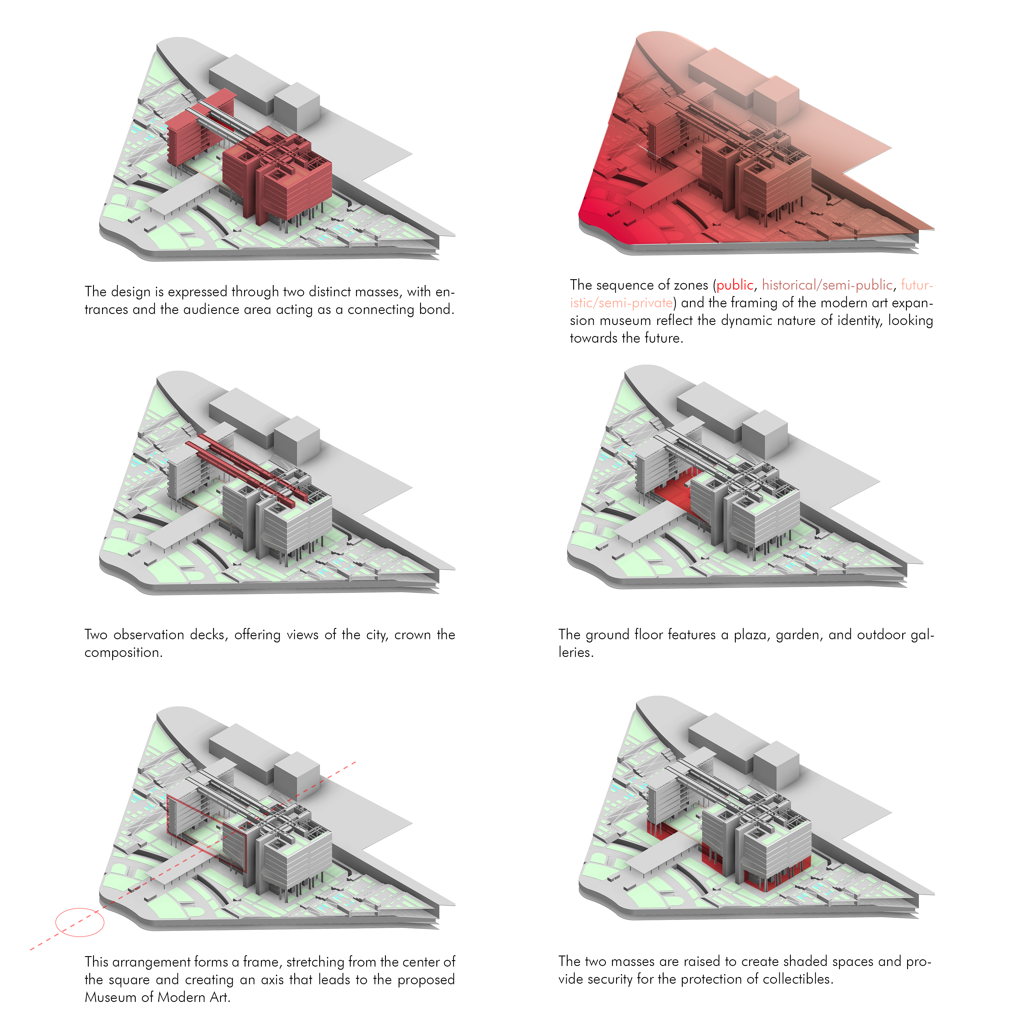 The museum features open gallery spaces, a central courtyard, and observation decks with panoramic city views. Flexible spaces accommodate different exhibits, and natural light is provided by domes. Clear circulation paths and resting zones make the museum accessible and inviting for all visitors.