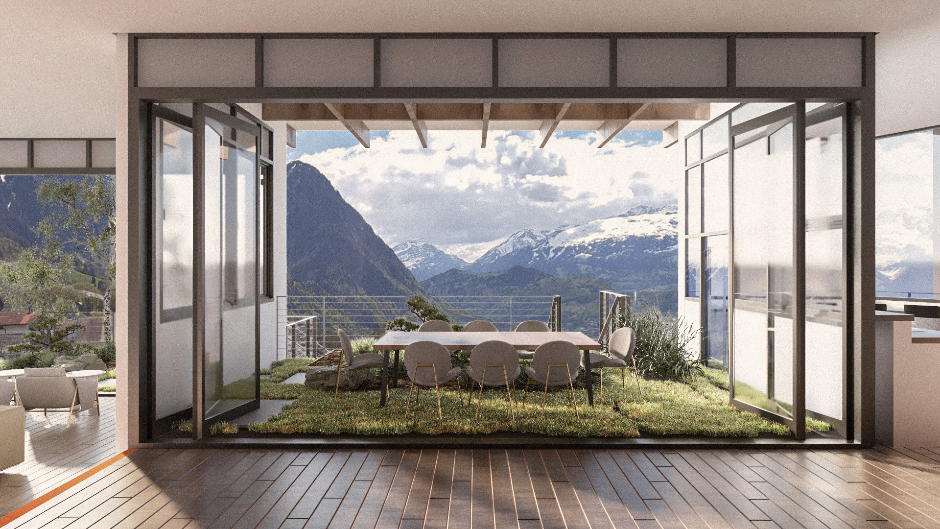 This project creates a seamless flow between indoors and outdoors, making the most of the views while maintaining a sense of comfort and intimacy. The living, dining, and kitchen areas are connected through subtle level changes and movable panels, allowing the space to adapt as needed. This design received an Honourable Mention in the Arcbazar “New Mountain Family Home” competition.