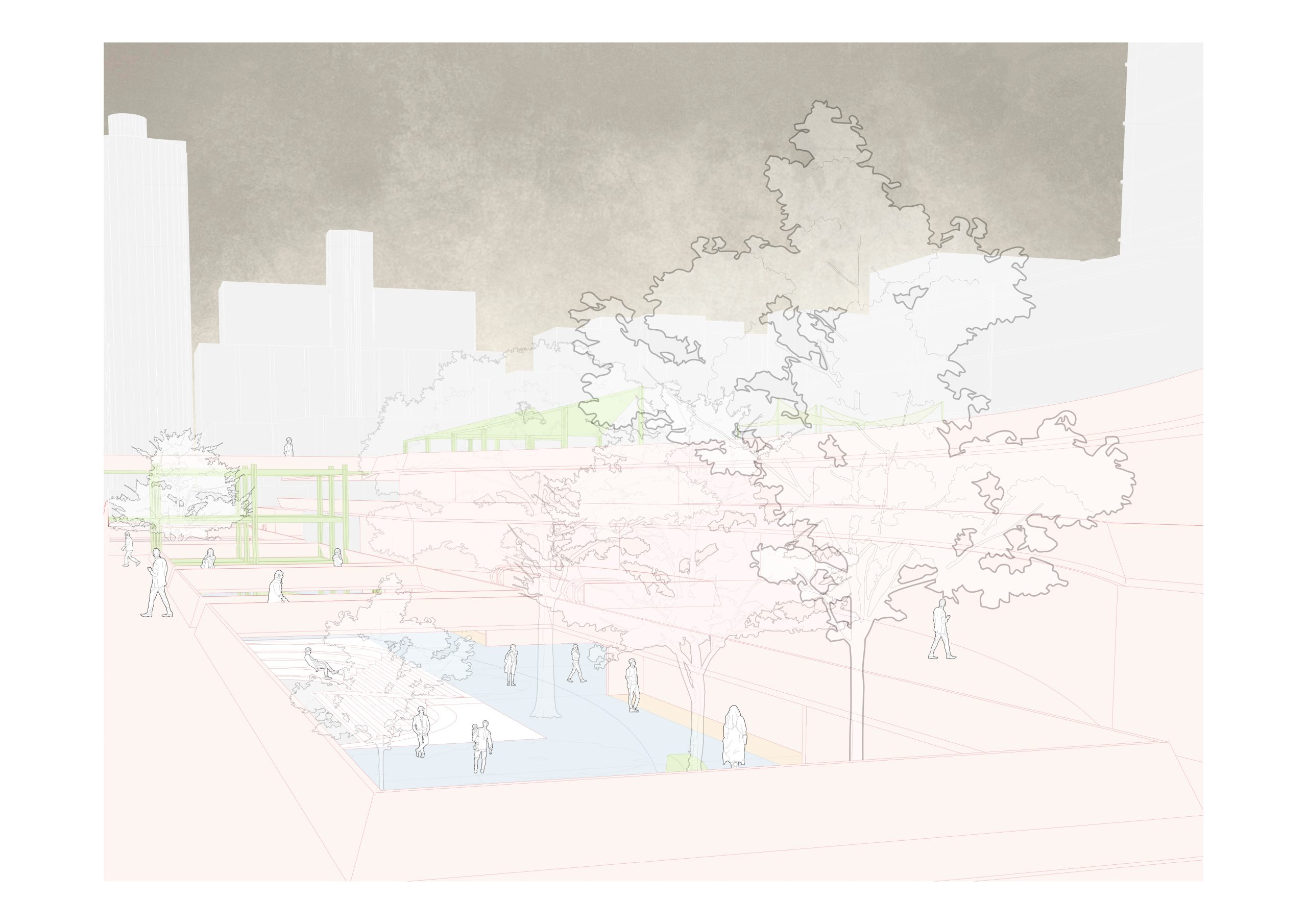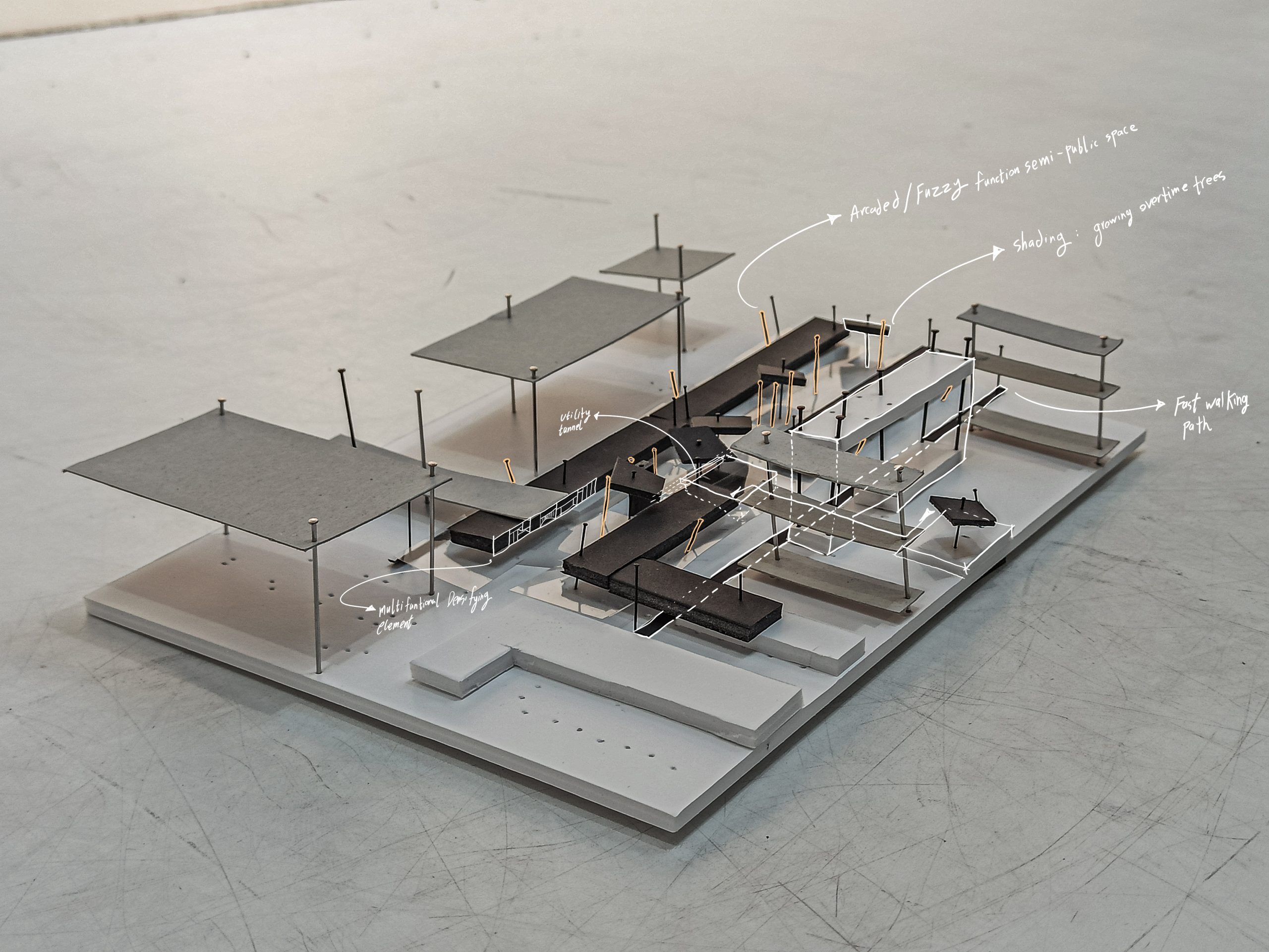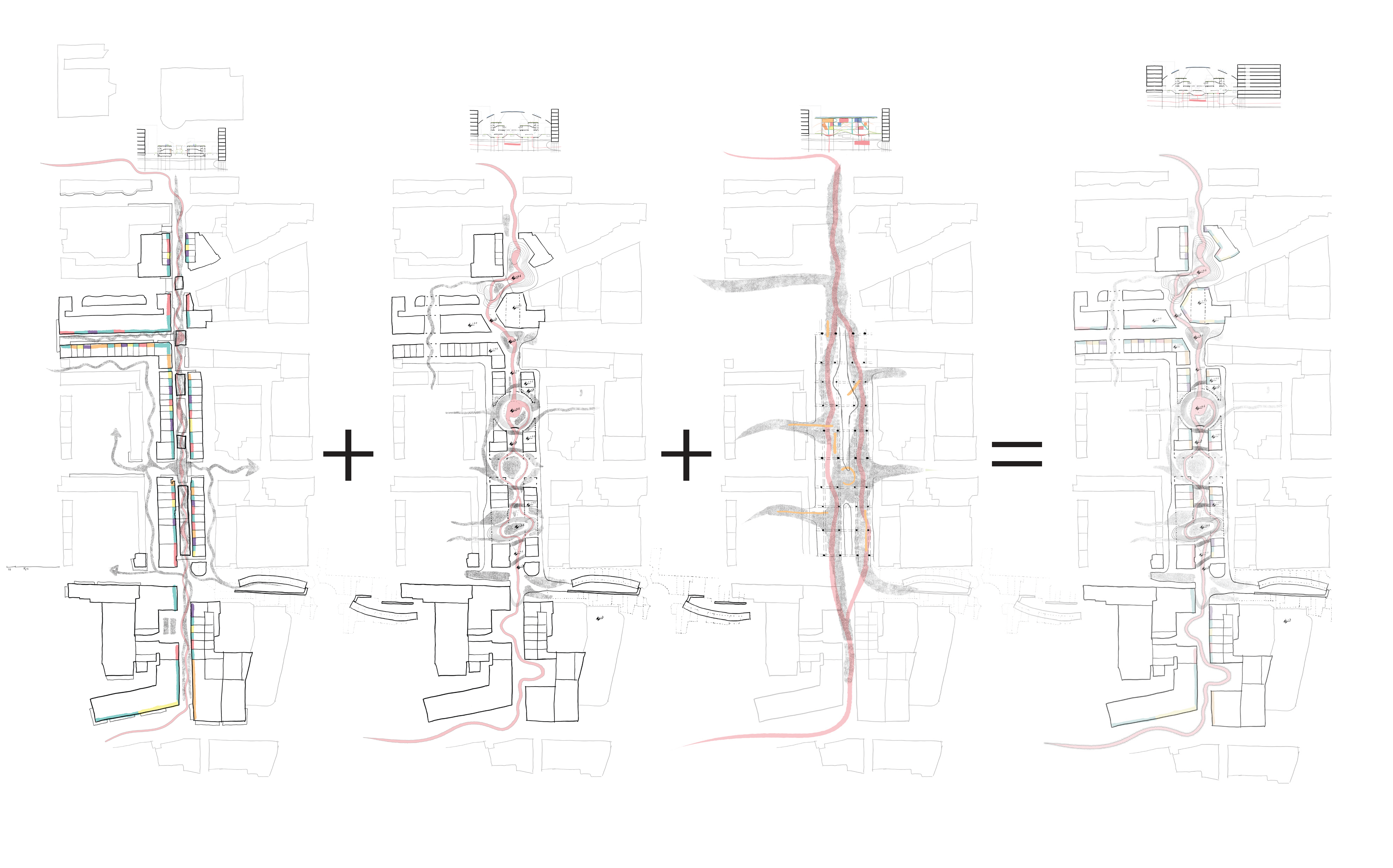 The plan incorporates slow and fast circulation paths, redefines edges to create new enclosures, and mitigates linearity with facade shifts. New functions are introduced to open spaces, and “fuzzy facades” blend public and private zones. Blue-green infrastructure, including a connected water system and shaded pathways, improves the microclimate and urban experience. Light-colored, sustainable materials are used for urban furniture and landscape elements, while densification and space reallocation optimize land use.