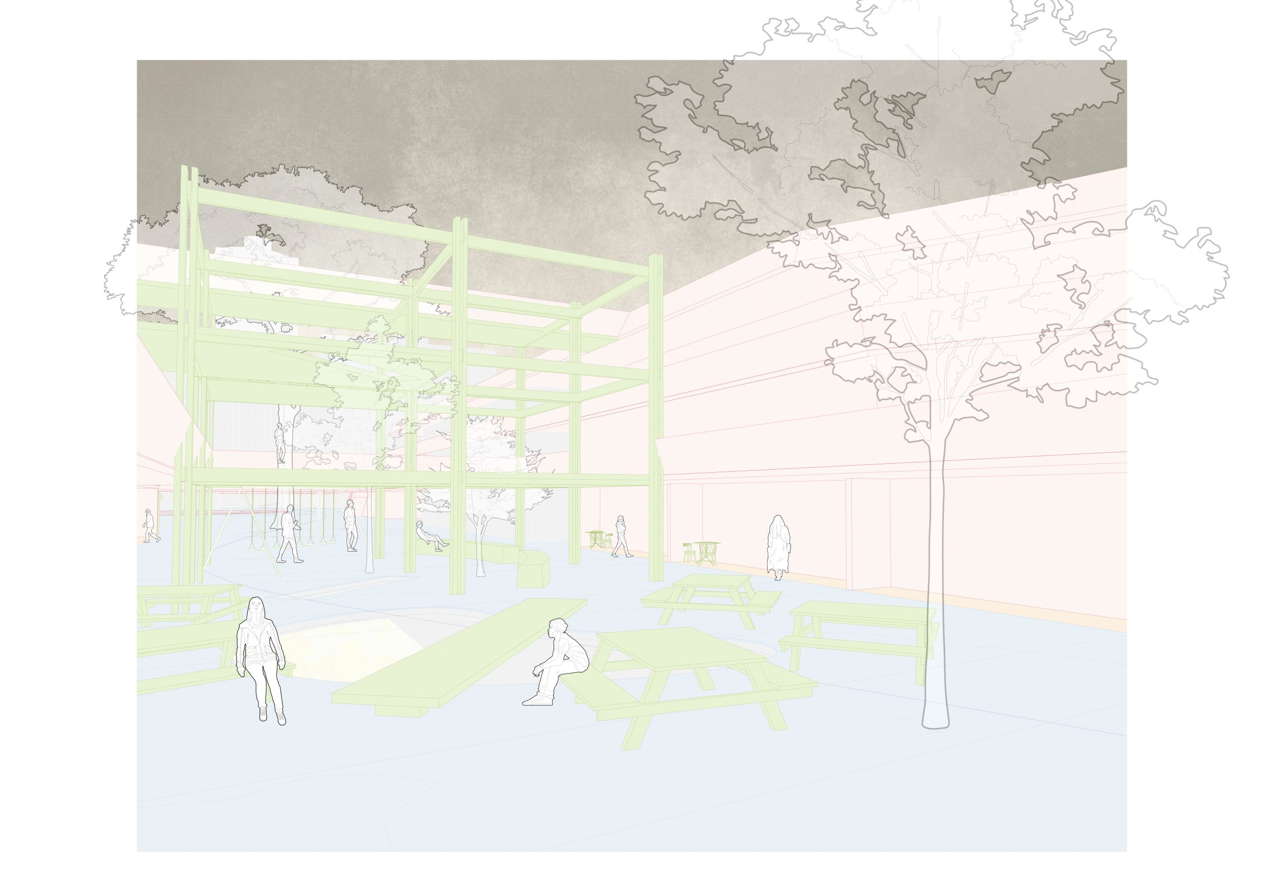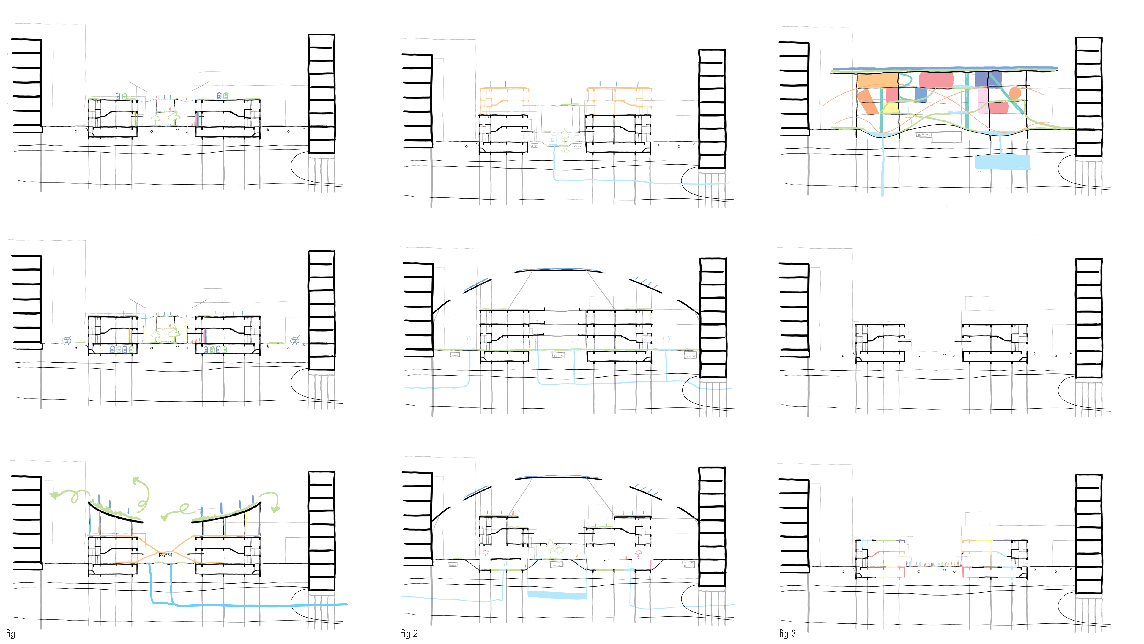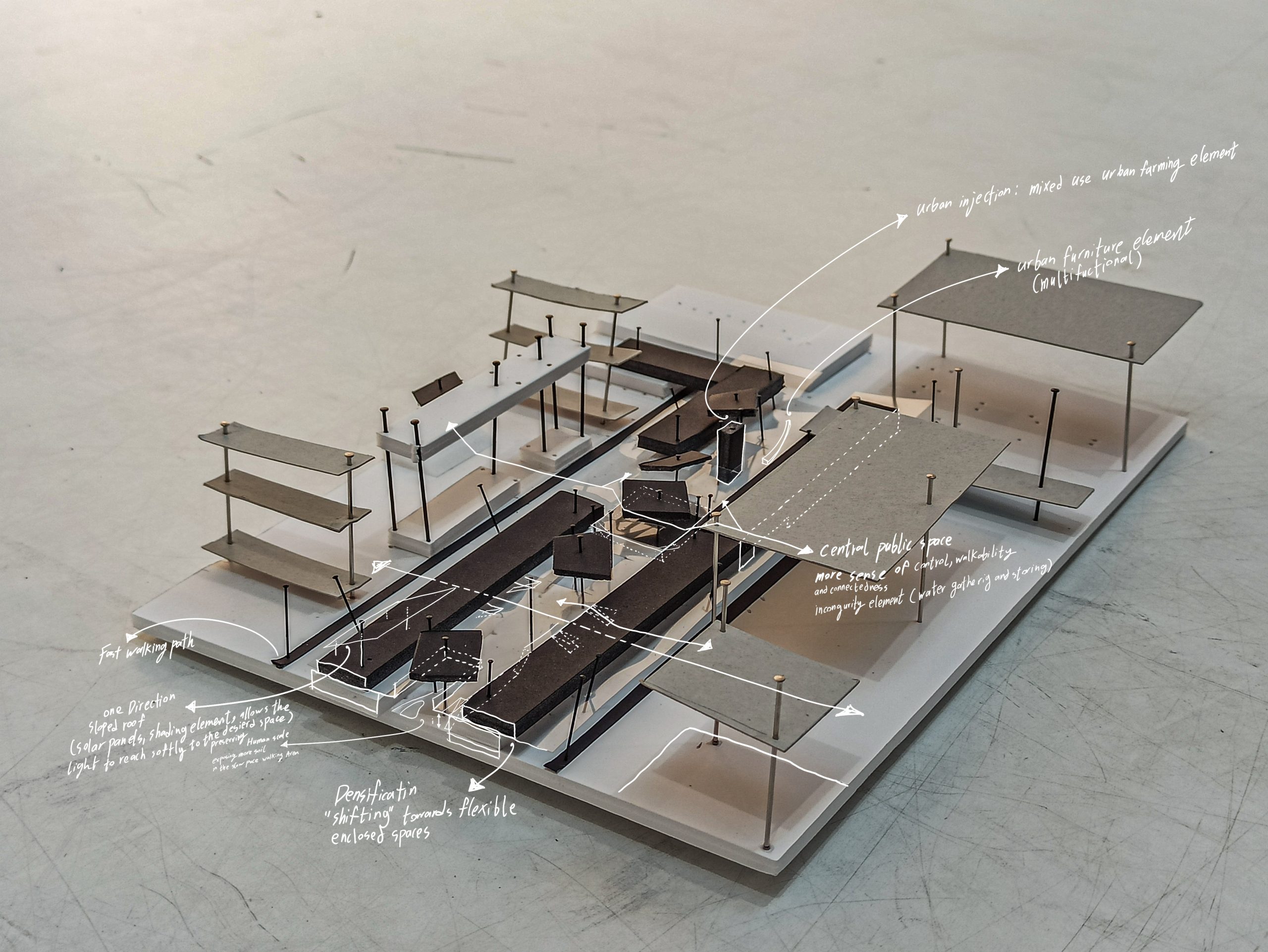 The plan incorporates slow and fast circulation paths, redefines edges to create new enclosures, and mitigates linearity with facade shifts. New functions are introduced to open spaces, and “fuzzy facades” blend public and private zones. Blue-green infrastructure, including a connected water system and shaded pathways, improves the microclimate and urban experience. Light-colored, sustainable materials are used for urban furniture and landscape elements, while densification and space reallocation optimize land use.
